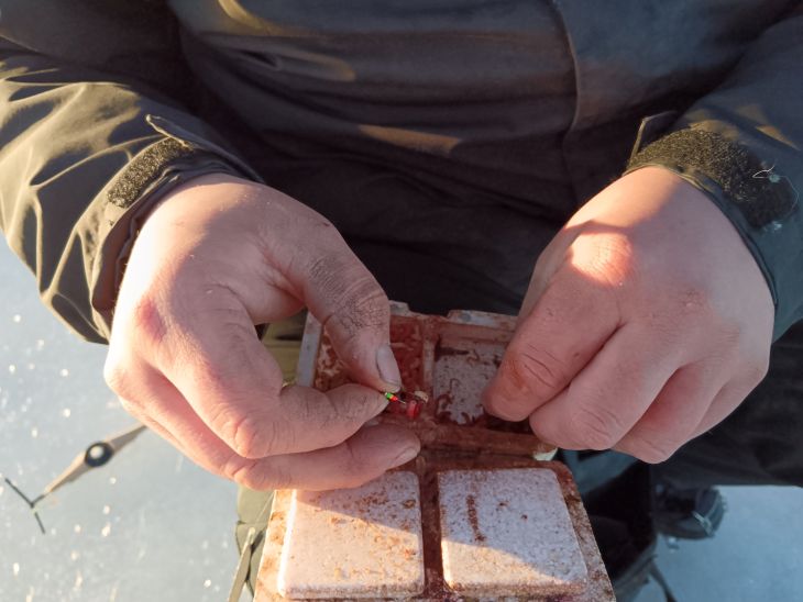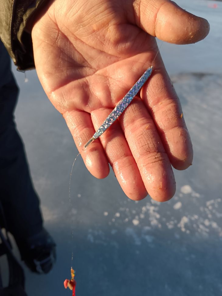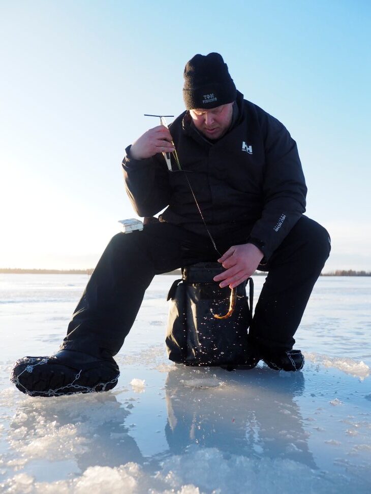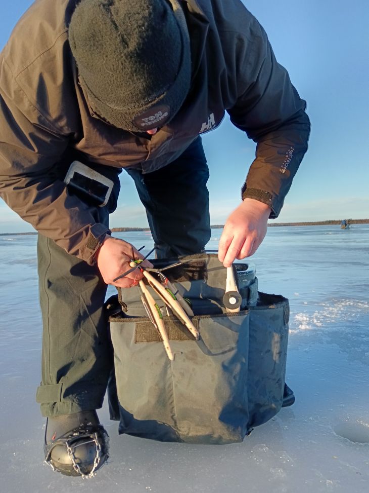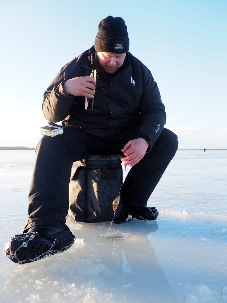 ”Tarkoitus on pilkkiä koko päivä tapsipilkillä tai jos kohdalle sattuu isompaa kalaa, niin koetan pilkkiä myös isolla morrilla. Syöttinä näissä käytän 2–3 kärpäsentoukkaa, sekä 2–3 surviaista kaverina, millä saa todennäköisesti kalat ottamaan paremmin kiinni. Pari ketju- ja värikoukkupilkkiä otan varmuuden vuoksi joukkoon, jos osun paremmin syövän kalan alueelle.”